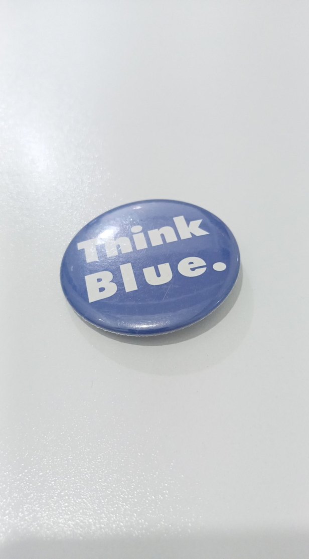 Üzerinde "Think Blue." yazan yuvarlak mavi renkli, sade ve minimalist tasarımlı erkek rozeti. Çantanıza takabileceğiniz hoş bir aksesuar.. (Arka kısmında yıpranma var.) Rozet koleksiyonerlerinin memnun kalacağını umuyorum:)