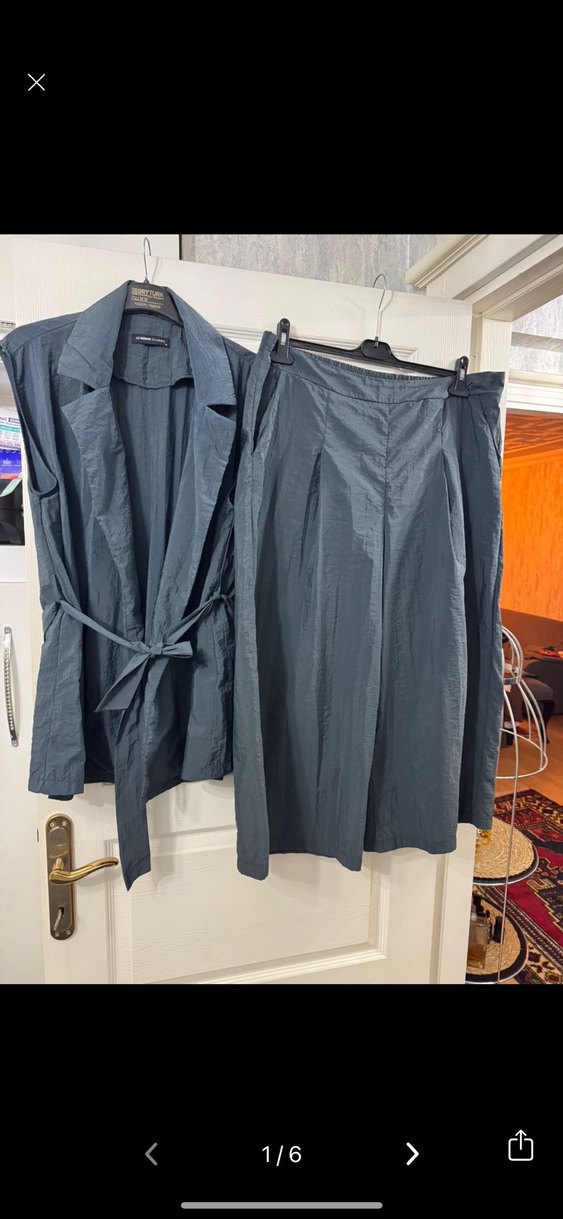 Mavi renkli, kolsuz ceket ve uyumlu pantolon dan oluşan keten kadın takımı. Kemerli ve regular fit, ofis için uygun. Ürün bu sezon ürünüdür deformemesi yoktur