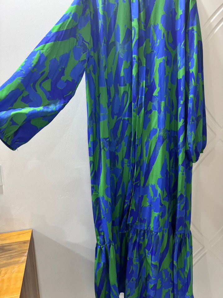 Yüksek yakalı, uzun kollu ve bol kesim bu uzun elbise, mavi ve yeşil bağlama desenli, akıcı sentetik kumaştan üretilmiştir. Açık hava etkinlikleri için uygundur. Hiç giyilmedi sıfır üründür