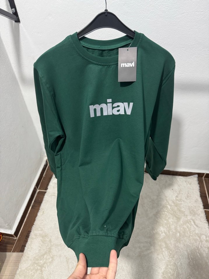 Yeşil renkli sweatshirt, uzun kollu ve yuvarlak yakalıdır. Rahat kesimi ve 'miav' baskısı ile günlük kullanıma uygundur.