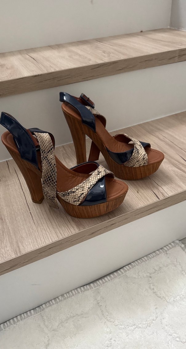 Mavi ve yılan derisi desenli, ahşap platformlu, tokalı kadın topuklu ayakkabılar. Bohem ve retro tarzları bir araya getirir, romantik akşamlar için uygun.