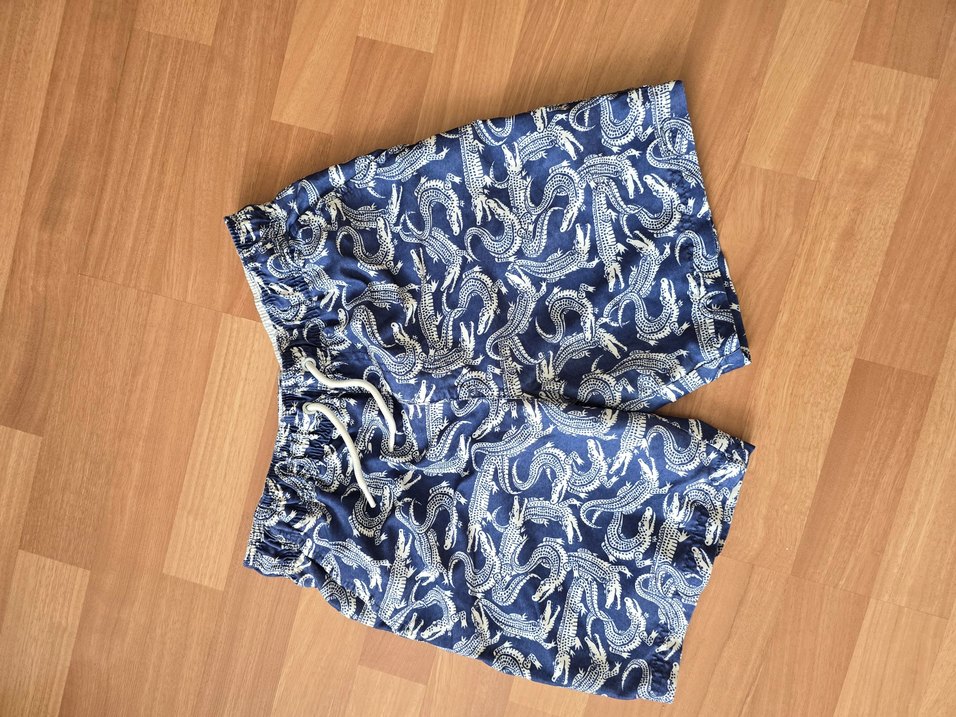 Mavi yılan desenli, bol kesim, volan detaylı bohem erkek mayo, plaj için uygun.