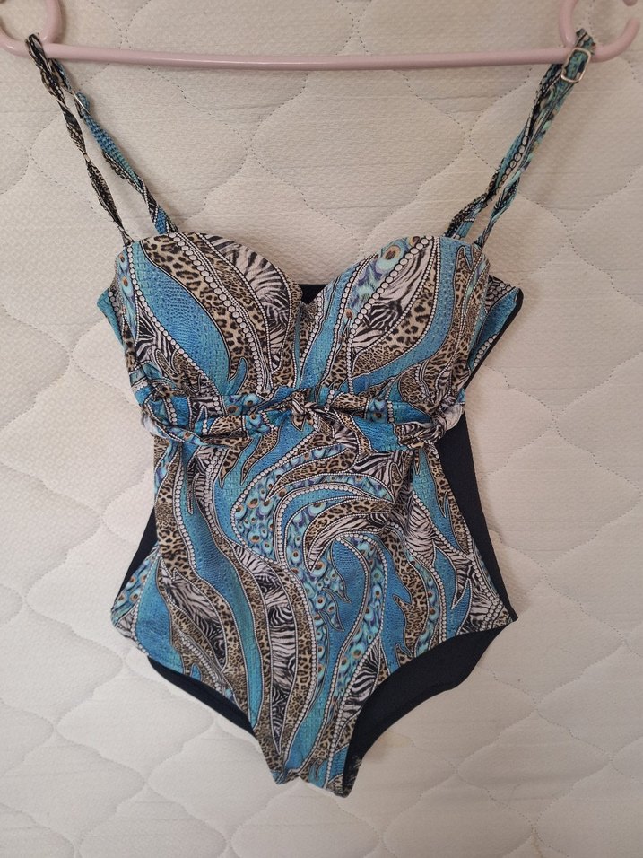 Koyu mavi yılan desenli, askılı ve tokalı, bohem tarz mini mayo. Sıkı oturan kesimiyle plajda kullanıma uygundur.