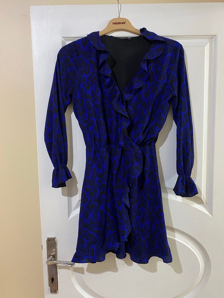 Mavi yılan desenli mini elbise, uzun kollu ve V yakalıdır. Fırfır detayları ve bol kesimiyle, sentetik kumaştan üretilmiştir. Günlük kullanıma uygundur.