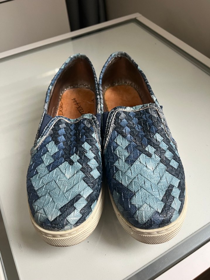 Koyu mavi yılan desenli kot espadriller, pileli detaylı ve dolgu topuklu. Bohem ve sokak stilini günlük kullanımda birleştirir.