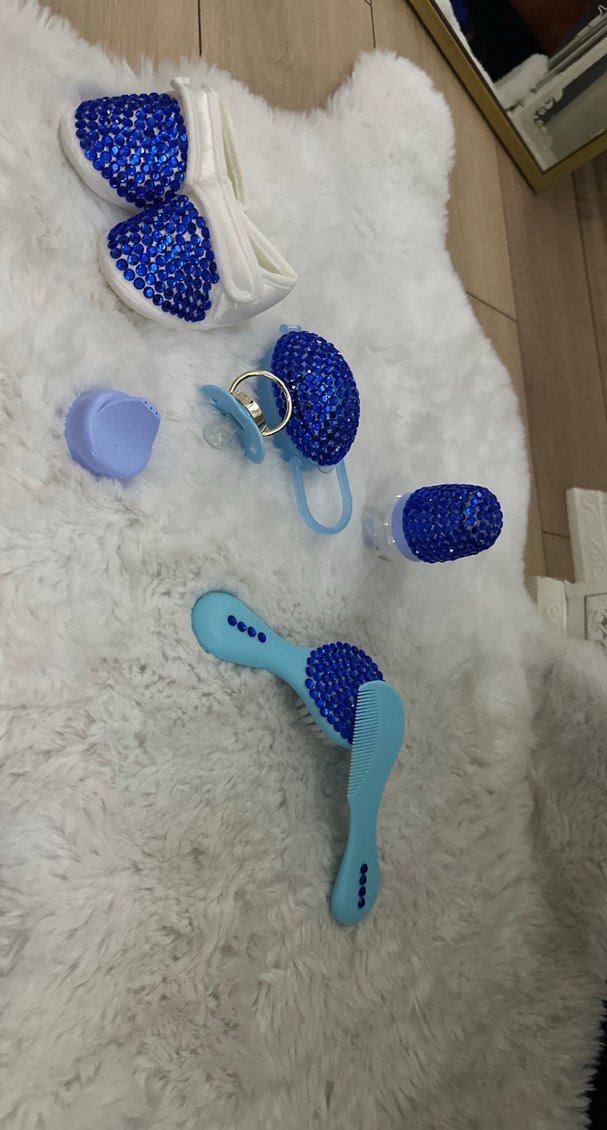 Renkli mavi yılan deseniyle mini boyutta emzirme aksesuar seti; emzik, tarak ve tırnak makası içerir. Kullanımı kolay ve şık.
