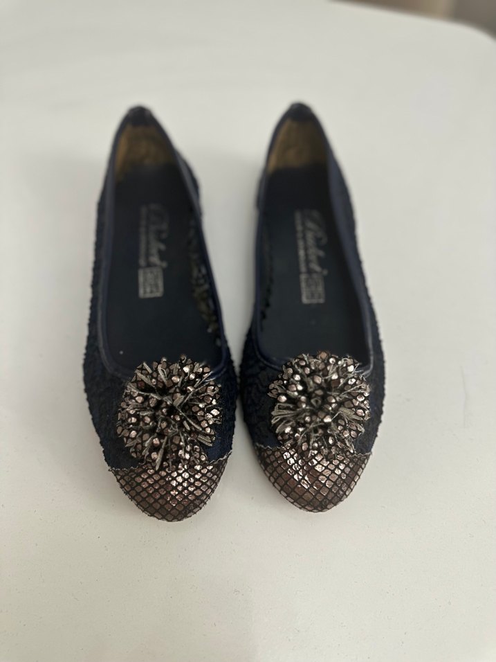 Mavi yılan desenli, payetli ve dolgu topuklu kadın babet. Kauçuk malzemeden üretilmiş, klasik ve şık bir görünüm sunar. Hiç kullanılmadı