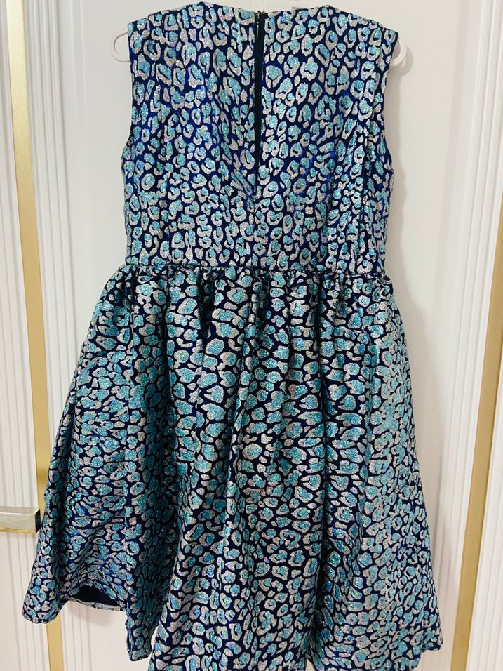 Mavi yılan desenli, V yakalı ve kolsuz midi elbise. Bol kesim ve pilili etek detayıyla avant-garde tarzda parti için uygun.