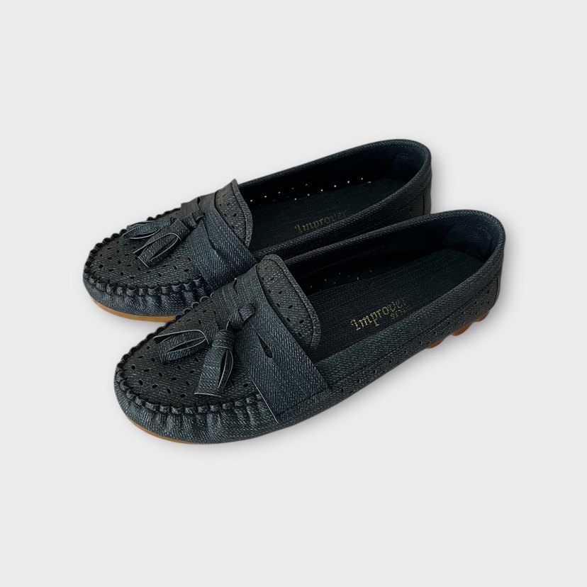 Mavi renkte, yılan desenli ve püsküllü detaylı kadın babet. Kauçuk malzemeden üretilmiş, klasik ve trend günlük kullanıma uygun ayakkabı.