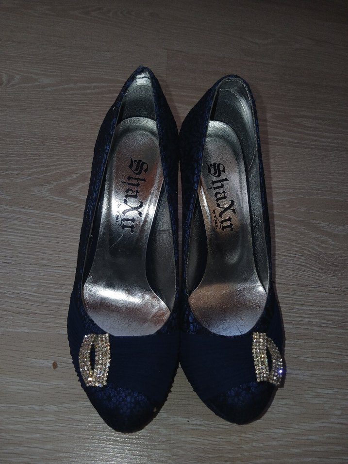 Parlak mavi yılan desenli, tokalı, yüksek topuklu kadın ayakkabısı. Gotik tarzda klasik zarafet sunar.