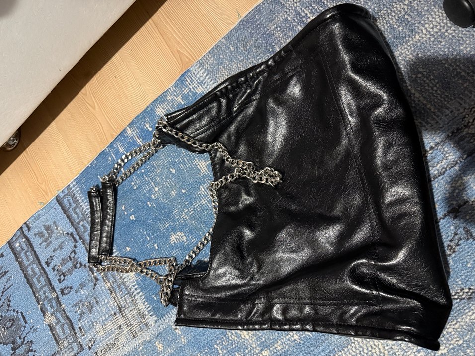 Parlak mavi yılan desenli, zincir detaylı kadın vücut zinciri. Biker tarzında, günlük kullanım için uygun, grunge punk havasında.