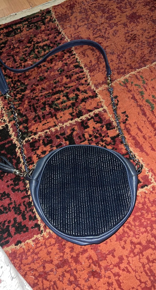 Yuvarlak şekilli, koyu mavi yılan desenli sentetik kumaştan yapılmış, zincir detaylı kadın çantası. Bohem ve retro Paris tarzını yansıtır, dış mekan kullanımı için uygundur.