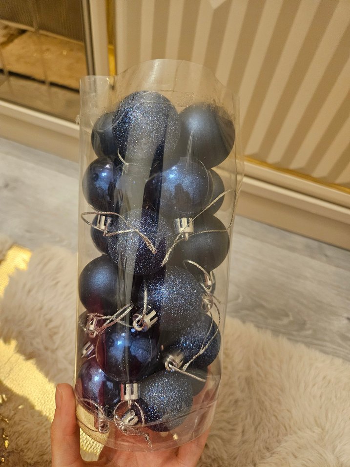 Parlak ve mat yüzeyli koyu mavi yılbaşı süs topları, şeffaf plastik tüpte saklanmaya hazır. 24 adet.