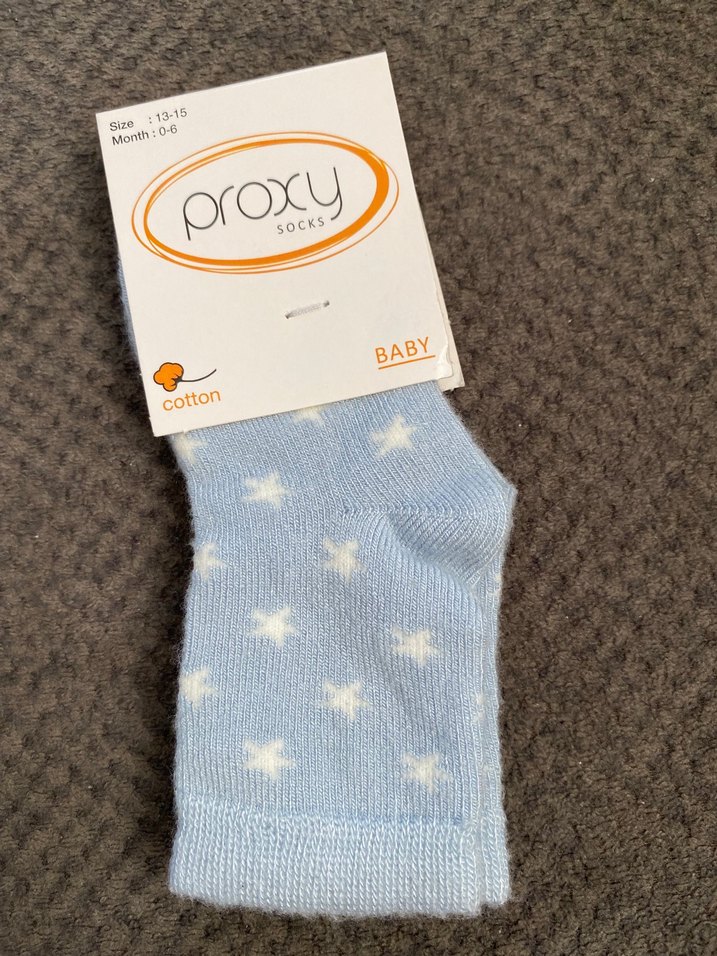 0-6 ay bebekler için mavi, beyaz yıldız desenli yumuşak pamuk çorap. Rahat ve konforlu kullanım sağlar.