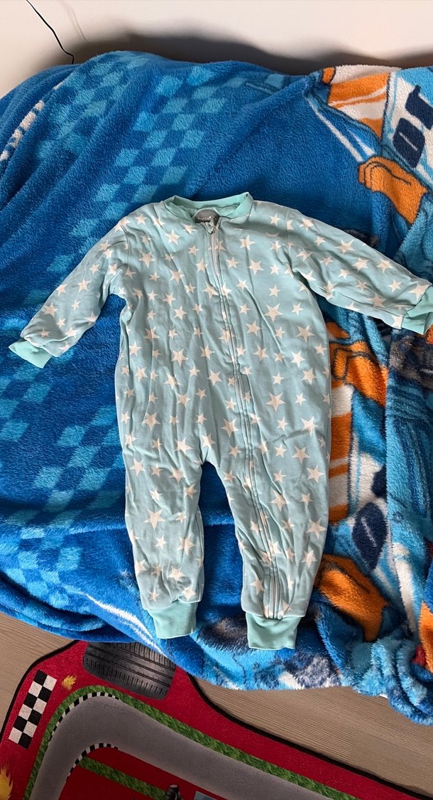 Pastel mavi renkte, uzun kollu, yakalı ve fermuarlı bebek tulumu. Yumuşak ve sıcak tutan kumaş, yıldız desenlidir. 2,5 - 3 yaş için uygundur. Son fotoğrafta küçük lekesi vardır. #uyku #tulumu #mavi #çocuk