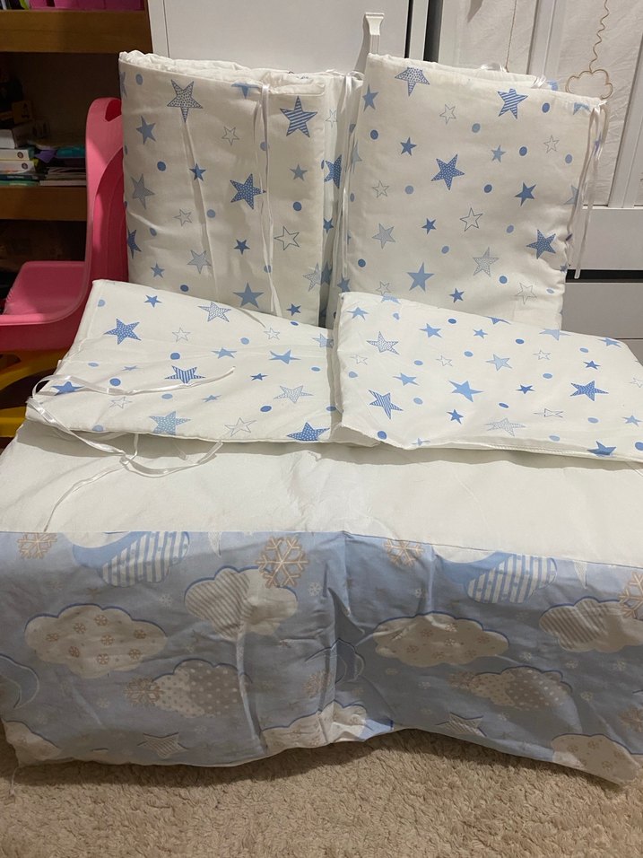 Yumuşak sentetik kumaştan yapılmış, pastel mavi ve beyaz yıldız desenli bebek uyku seti, bulut detaylı yastık ve örtüler içerir.