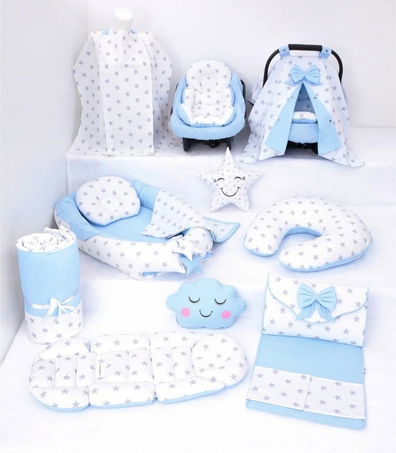 Mavi yıldız desenli, yumuşak ve rahat kumaştan yapılmış bebek uyku tekstil ve aksesuar seti.
