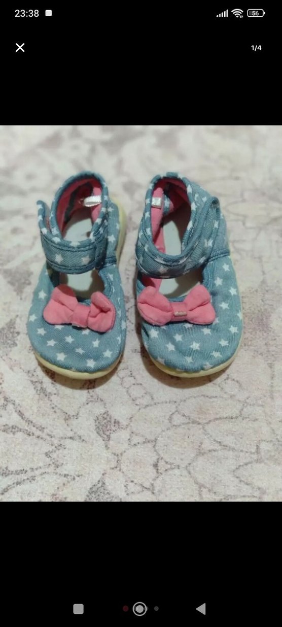 Pastel mavi renkte, yıldız desenli ve pembe yumuşak fiyonk detaylı, kauçuk tabanlı ilk adım ayakkabısı.