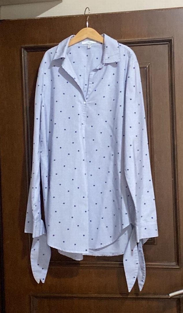 Pamuklu, mavi yıldızlı, uzun kollu ve düğmeli, yakalı bol kesim gömlek. Rahat ve günlük kullanıma uygun.