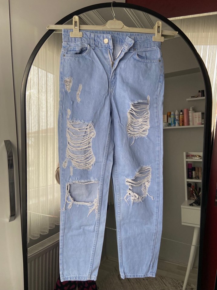 Açık mavi yırtık kot pantolon hiç giyilmedi