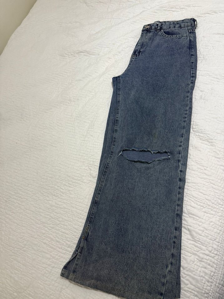 Mavi renkte, bol kesim ve yırtık detaylı denim kadın jean. Midi boyda, desen içermeyen rahat bir sokak stili pantolon.