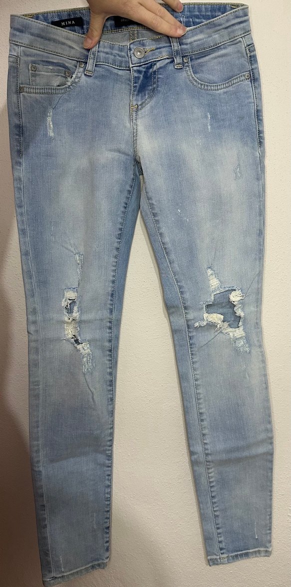 Yırtık detaylı ve tokalı, pastel mavi renkte, dar kesim kadın denim pantolon. Günlük sokak stiline uygun midi boyda rahat bir parça.