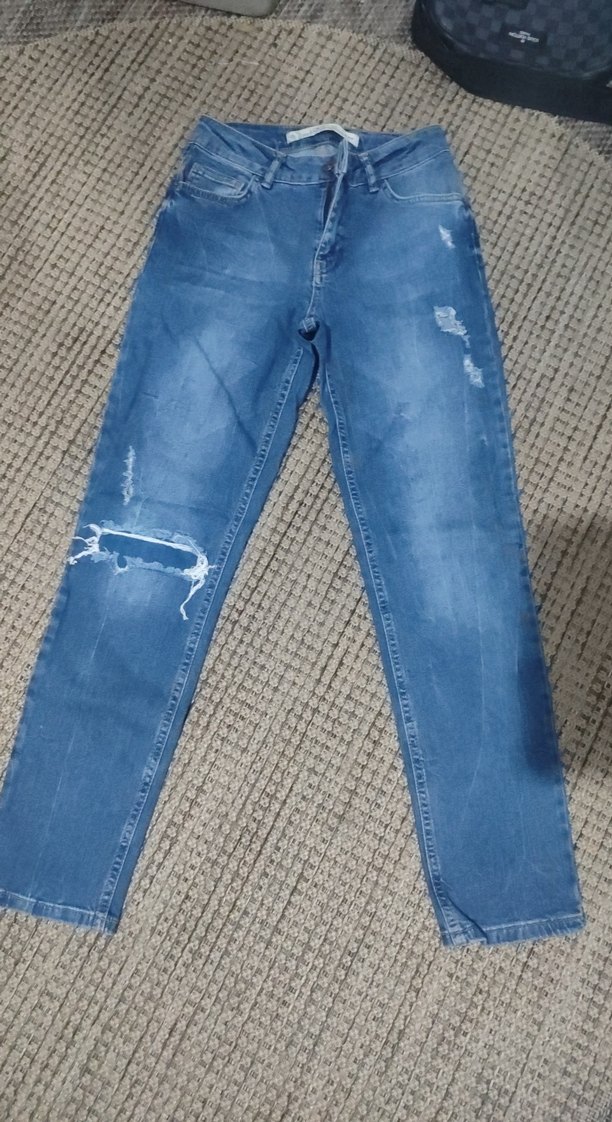 Mavi denim kumaştan, regular fit kesime sahip kadın kot pantolon. Yırtık detayları ve kemer tokası ile günlük sokak stiline uygun.