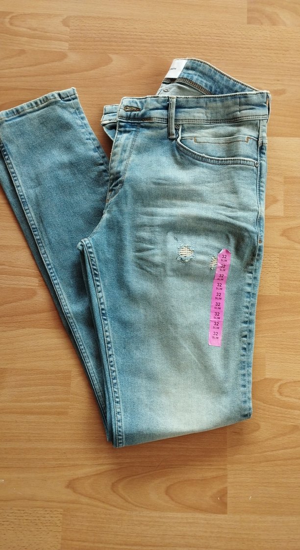 Mavi denim jean, normal boy, baskılı ve yırtık detaylarla günlük kullanıma uygun rahat kesim.