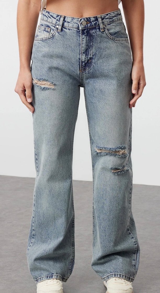 mavi yırtıklı yüksek bel Wide leg jeans