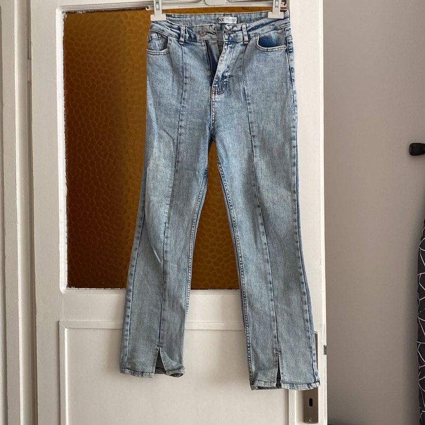 Mavi pastel tonlarda, yırtmaçlı midi boy, regular fit denim kadın pantolon. Günlük kullanıma uygun, rahat ve normcore tarzda.