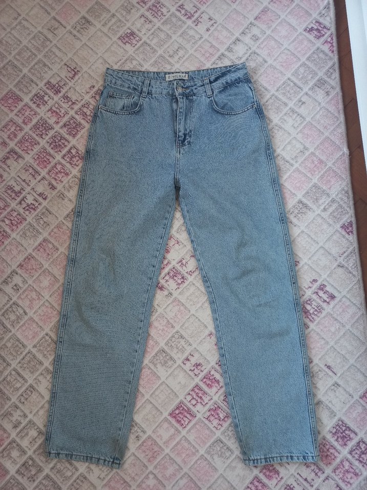 Mavi yüksek bel, rahat kesim ve normal boyda denim kadın jean. Günlük kullanım için zahmetsiz şıklık sunar, trend sokak stiline uygundur.