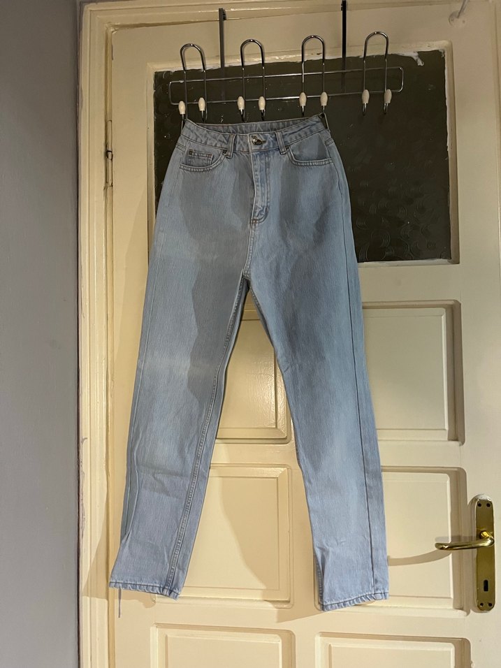 Mavi renkli, rahat kesim kot pantolon. Desensiz, pastel tonlarda. terzi islemi gordu kemer detaylarinin hizasi degistigi icin belinde mavilik var. hem bel hem pacalardan daraltma yapildi 34-36 bedene uygun