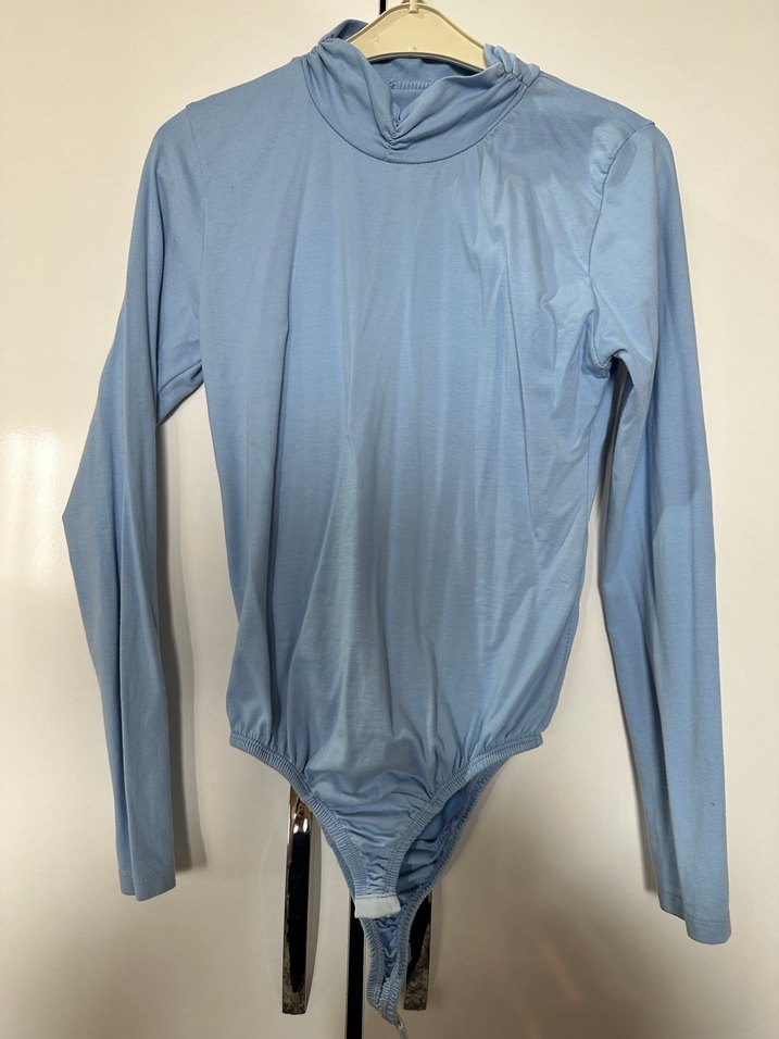 Mavi pastel renkte, yüksek yakalı ve uzun kollu, ince kesim sentetik kumaştan bluz. Midi boy ve desensiz tasarımıyla rahat ve şık bir görünüm sunar.