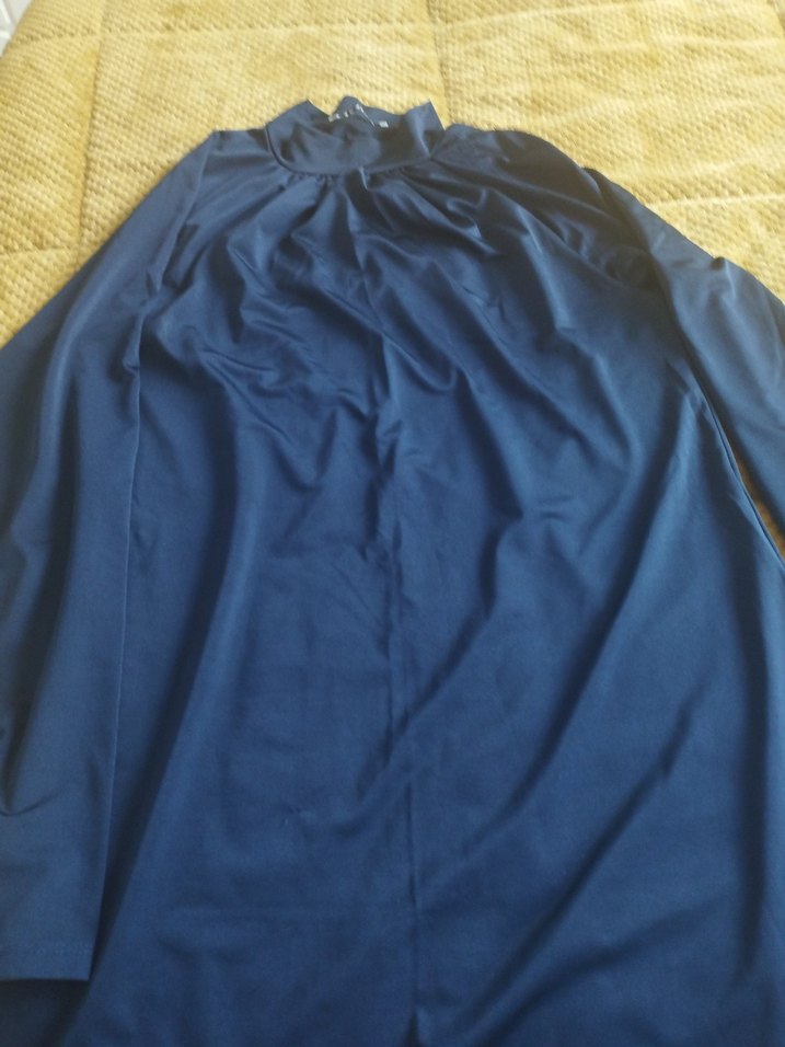 Parlak mavi içlik, yüksek yakalı ve uzun kollu olup, bol kesimi ve drapeli tasarımıyla günlük kullanıma uygundur.