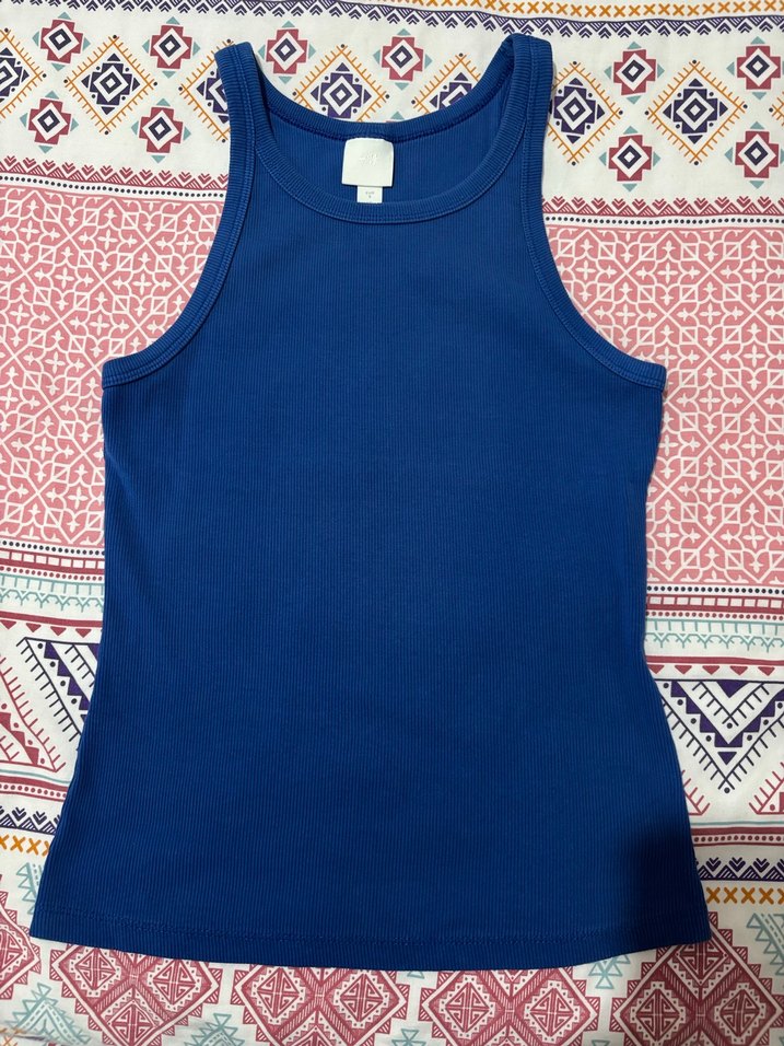 Mavi renkli, yüksek yakalı ve kolsuz kadın atlet, sentetik kumaştan üretilmiş ve vücuda oturan kesime sahip. Günlük kullanıma uygun, rahat ve şık bir parça.