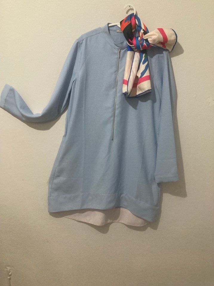 Mavi renkte, yüksek yakalı ve uzun kollu kadın tunik. Yumuşak sentetik kumaştan üretilmiş, önü farklı duru gıyılınceGünlük rahat kullanıma uygun. Eşarp dahıl
