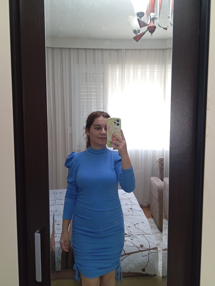 Mavi, yüksek yakalı ve uzun kollu, yumuşak ve sıcak kumaştan midi mini elbise. Minimalist ve rahat şıklık sunar, günlük kullanıma uygundur.