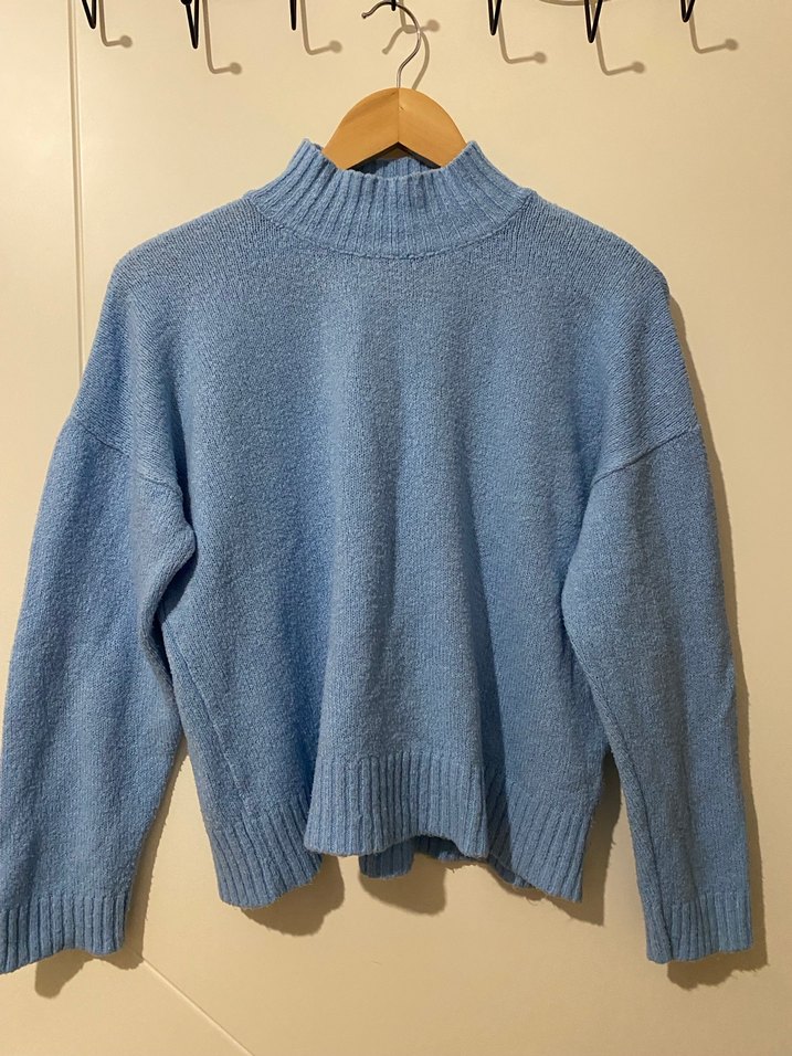 Mavi renkli, triko dokulu kazak. Günlük kombinler için idealdir.bebek mavi çok sevimli ve geniş kesim en 60 boy 58 markası temsilidir