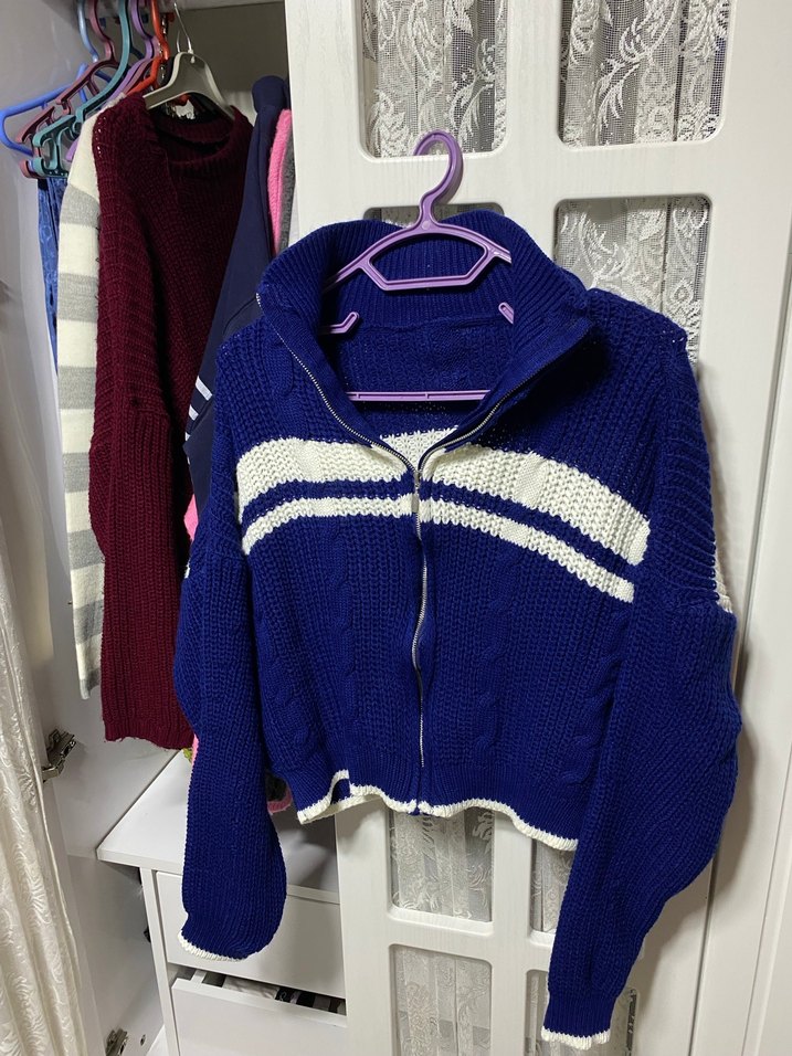 Mavi renkli, yüksek yakalı, uzun kollu örgü kadın kazak. Normal midi boyda, fitted kesim ve rahat bir tarz sunar. Günlük sokak giyimine uygun.