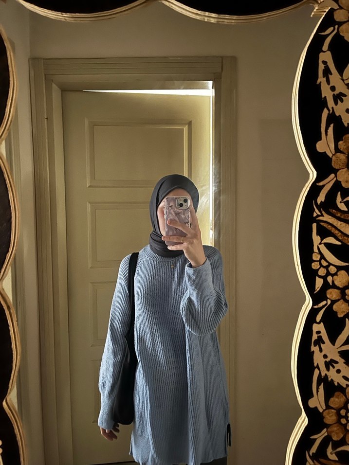 Mavi renkte, yüksek yakalı ve uzun kollu, salaş kesim midi uzunluğunda triko kazak, rahat ve sade günlük kullanım için uygundur.