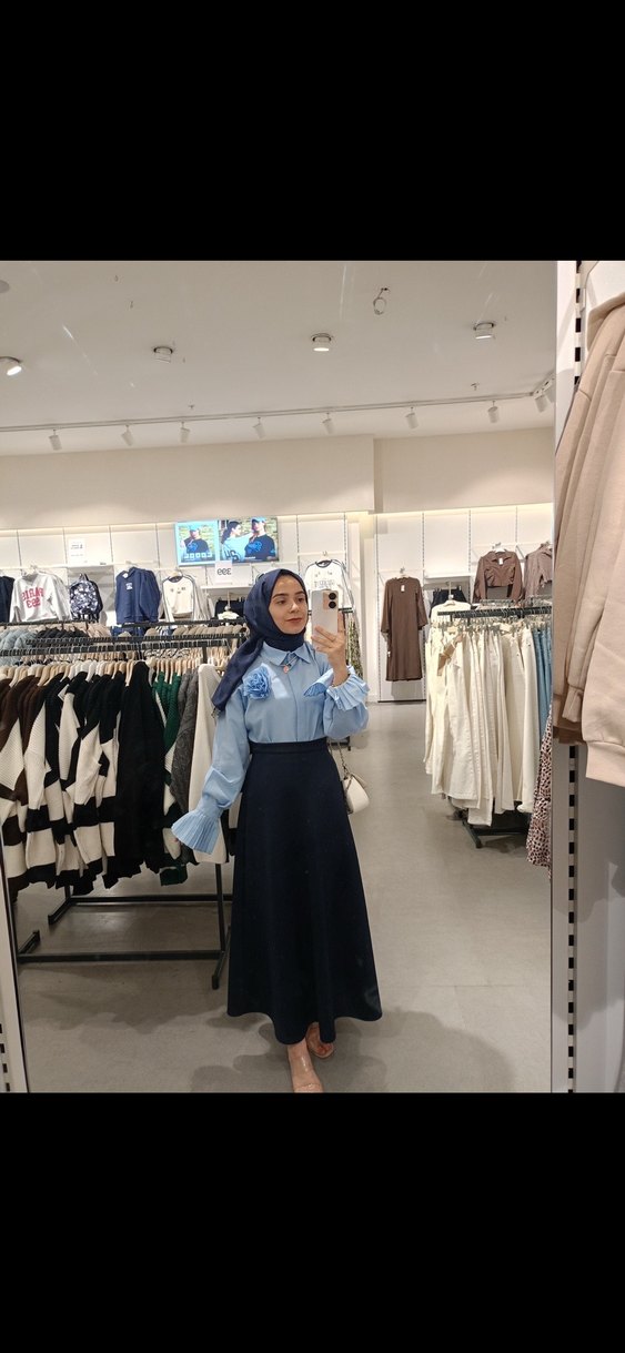 Mavi denim kumaştan, yüksek yakalı ve uzun kollu, baskılı desenli tesettür boy takım . Rahat kesim ve ofis için uygun, sade ve şık tasarım. İsteğe bağlı ayır ayrı da satılır