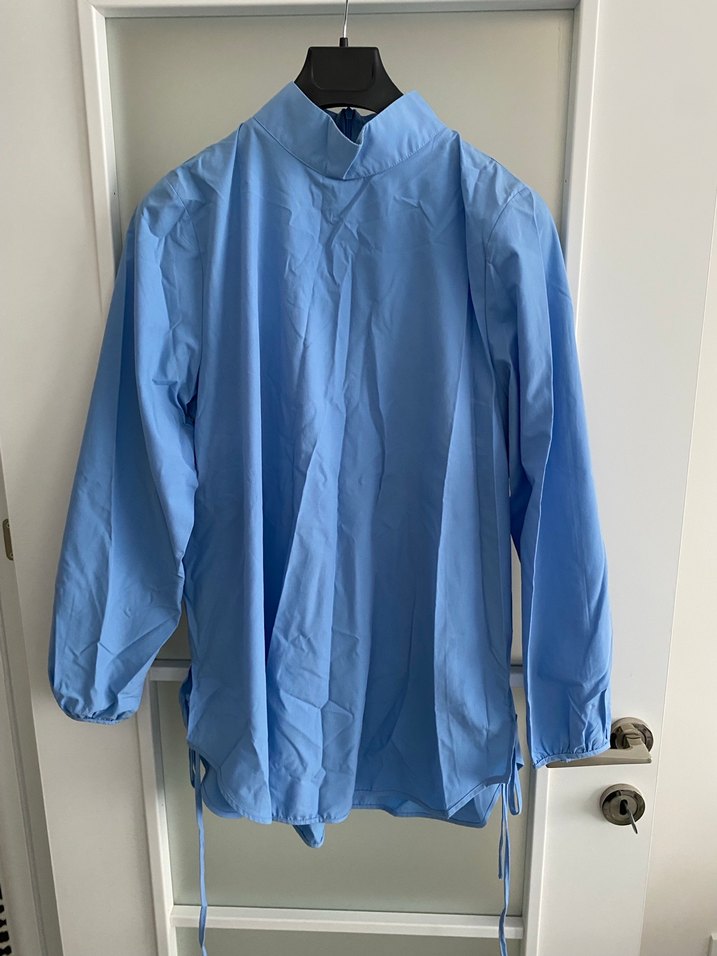 Mavi, yüksek yakalı, uzun kollu kadın gömleği, rahat kesimli ve yumuşak sentetik kumaştan üretilmiştir. Düz ve pastel tonu günlük kullanıma uygundur, zahmetsiz şıklık sunar.