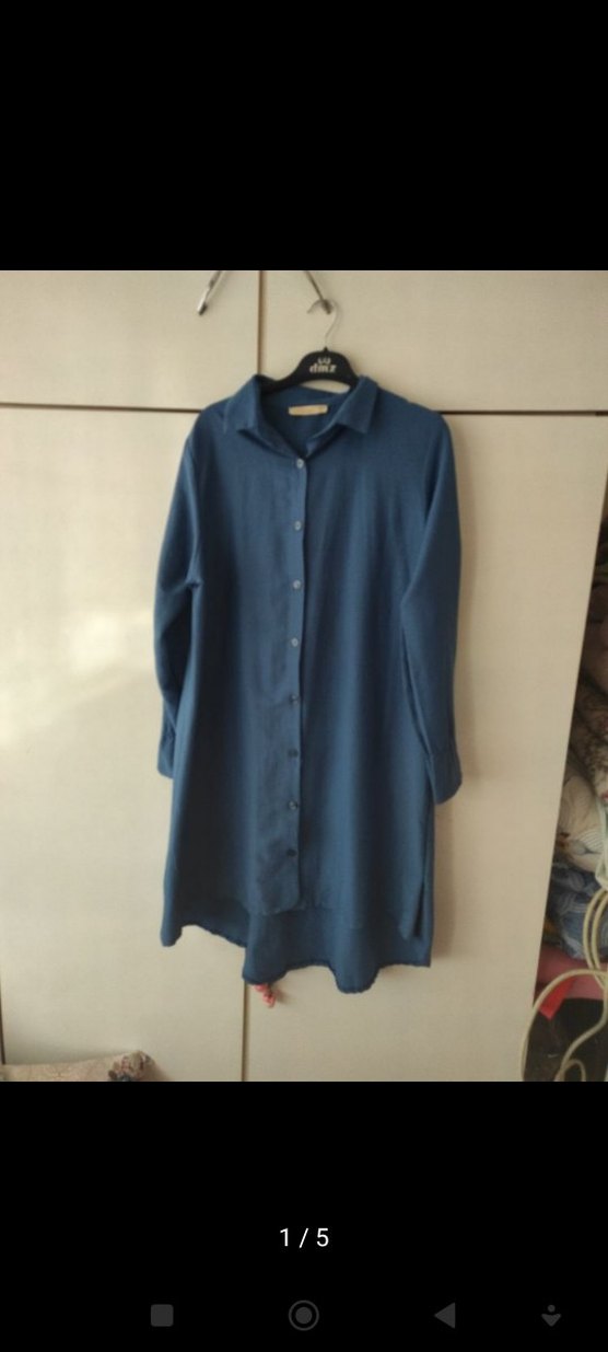 Mavi , düğmeli önü ve uzun kollu, yakalı gömlek elbise. Rahat kesim ve midi boy, gündelik kullanıma uygundur.