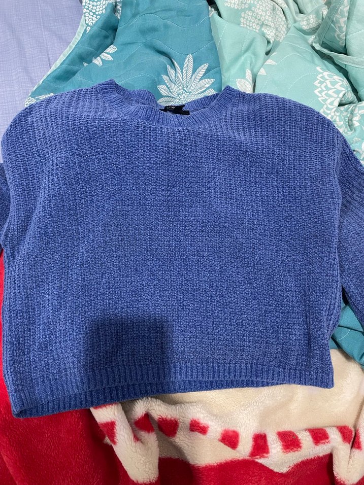Mavi renkli, örgü kadın kazak; bisiklet yaka, uzun kollu ve bol kesimdir. Rahat ve sade tasarımıyla günlük kullanıma uygundur. 1 ke giyildi . Göbekte bitiyor crop gibi
