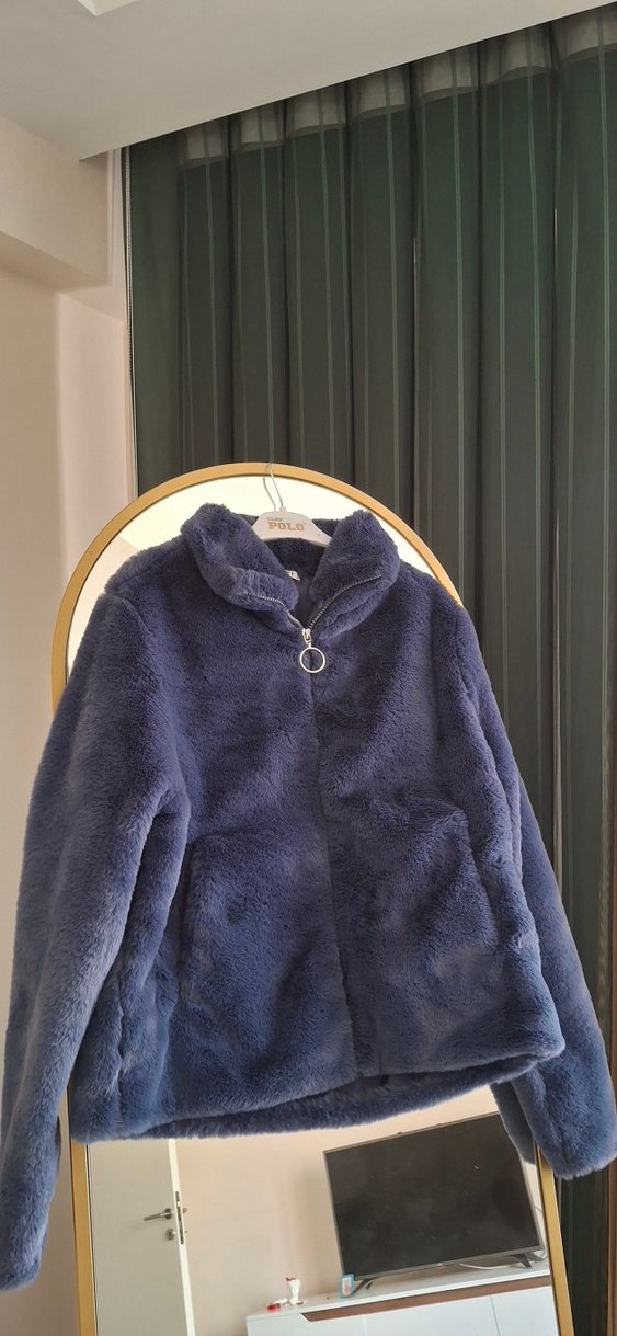 Mavi yumuşak kürklü kumaş, kesik yaka ve uzun kollu. Bol kesim ve midi boyda, günlük rahat kullanım için ideal. Fermuarında halka detay bulunur.