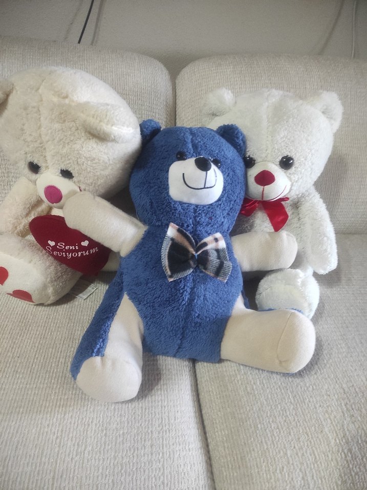 Yumuşak dokulu, renkli mavi peluş ayı oyuncak, üzerinde kareli papyon bulunmaktadır.