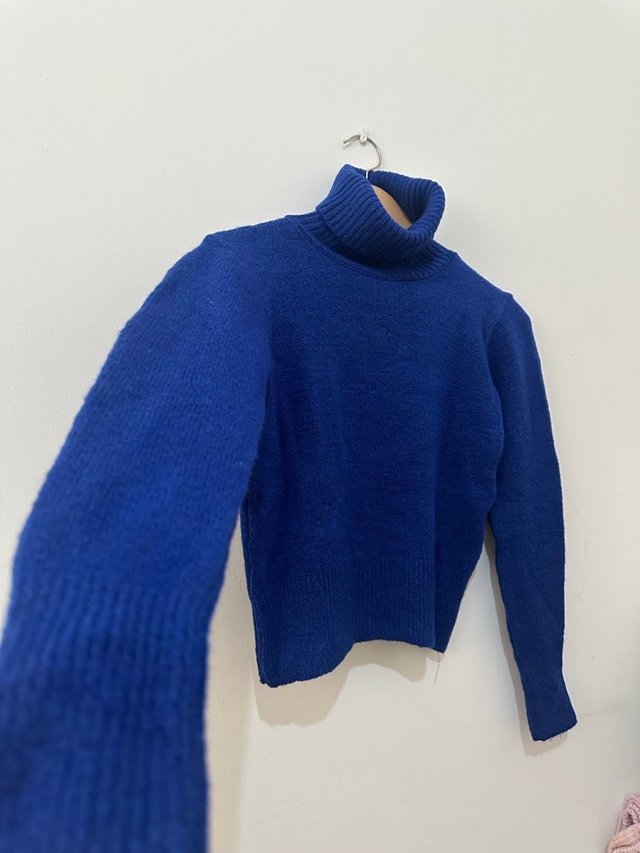 Bu mavi yün kadın kazak, boğazlı ve uzun kollu olup, rahat ve renkli dokusu ile günlük kullanıma uygundur.