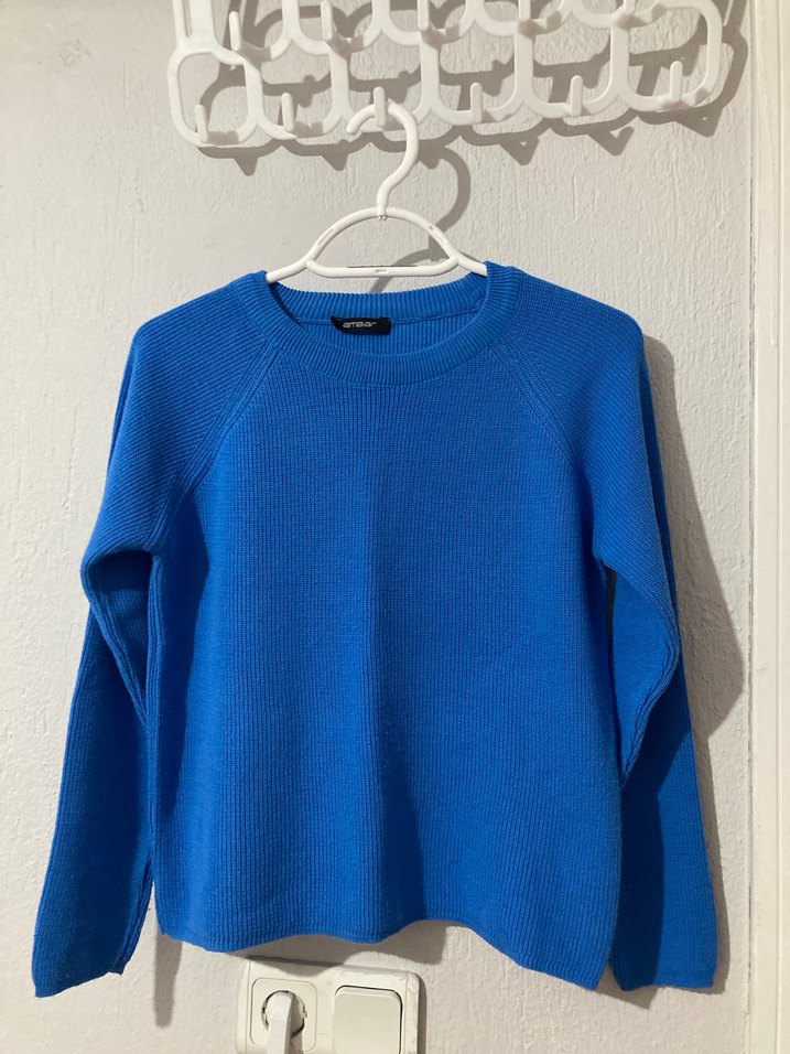 Bisiklet yakalı, uzun kollu kadın kazağı, yumuşak yün örme kumaştan yapılmıştır. Rahat kesimi ve parlak mavi rengi ile minimalist normcore tarzına uygundur.
