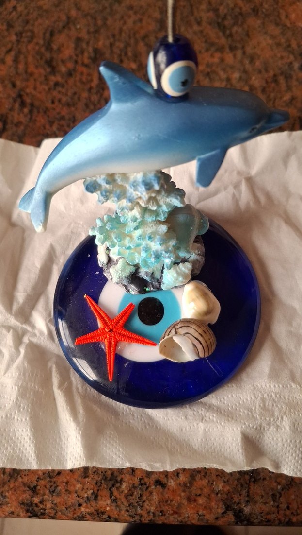 Canlı renklerde, mavi yunusun mercan üzerinde zıpladığı, deniz kabukları ve deniz yıldızı bulunan yuvarlak tabanlı figürin, deniz temalı küçük bir bayrakla tamamlanmıştır.