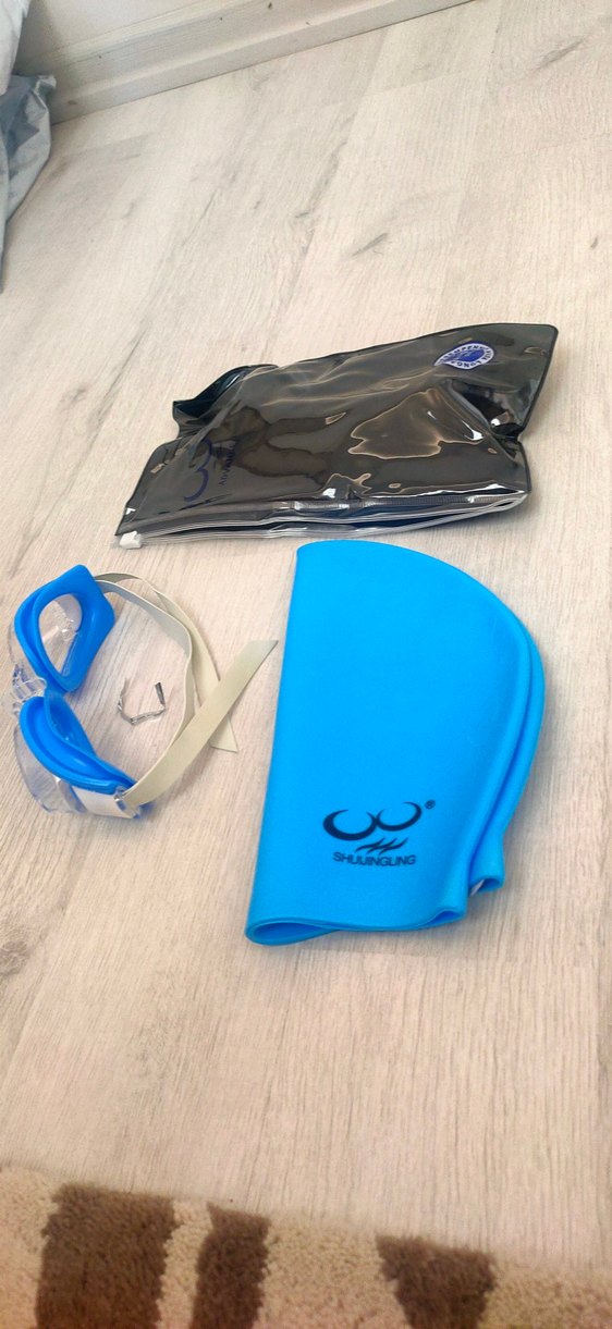 Mavi renkli, yüzücü gözlüğü ve uyumlu yüzme bonesi. Düz ve sıkı oturan tasarıma sahiptir. ♂️